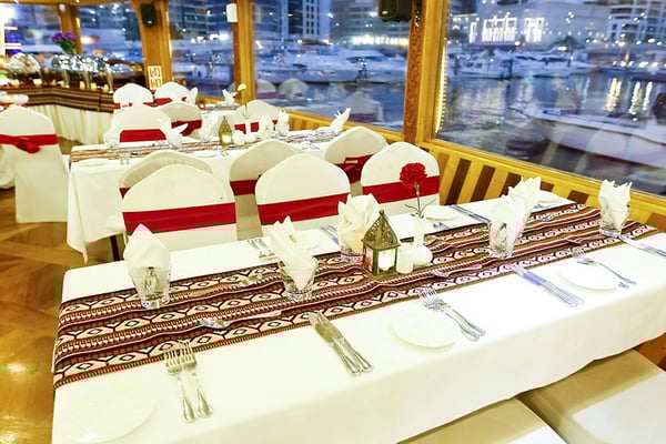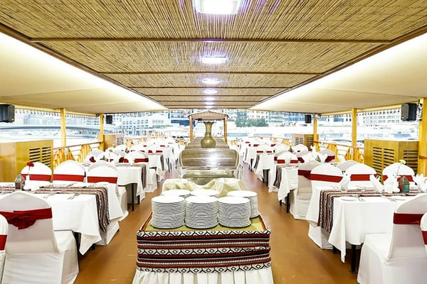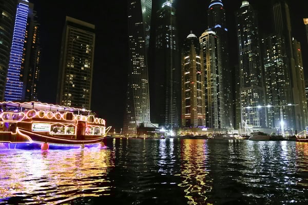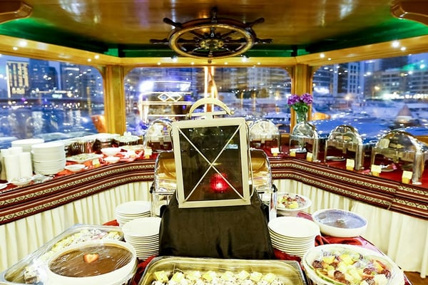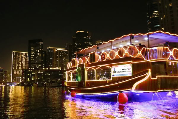 두바이 크릭의 전통 다우에서 저녁 식사와 반짝이는 야간 조명을 즐겨보세요.
