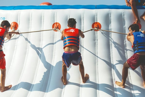 Плавайте, лазайте, прыгайте и скользите, исследуя трассу из 7 надувных элементов.